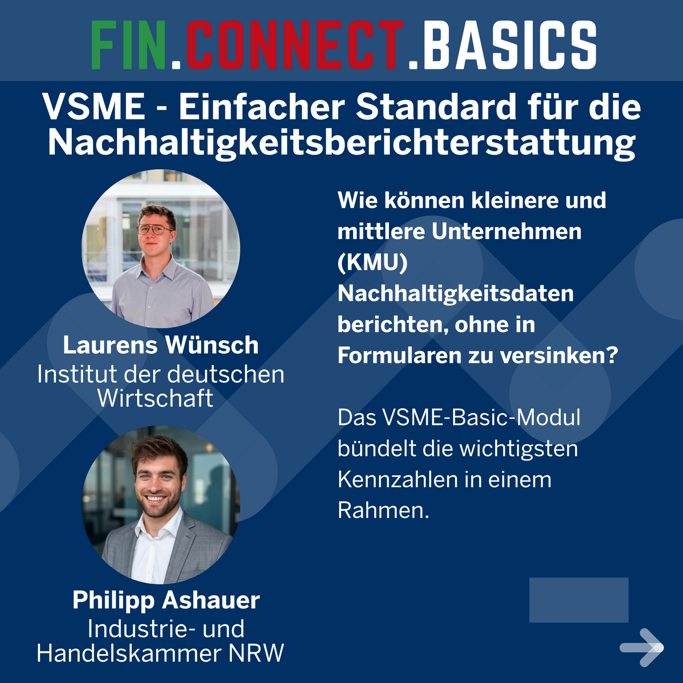 CSRD, SFDR, EU-Taxonomie – Nachhaltigkeitsberichterstattung ist wichtig, aber oft bürokratisch und komplex. Fin.Connect.NRW unterstützt KMU mit umfassenden Informationen zu verpflichtenden und freiwilligen Standards, praxisnahen Weiterbildungsangeboten und Best Practice-Beispielen aus NRW.