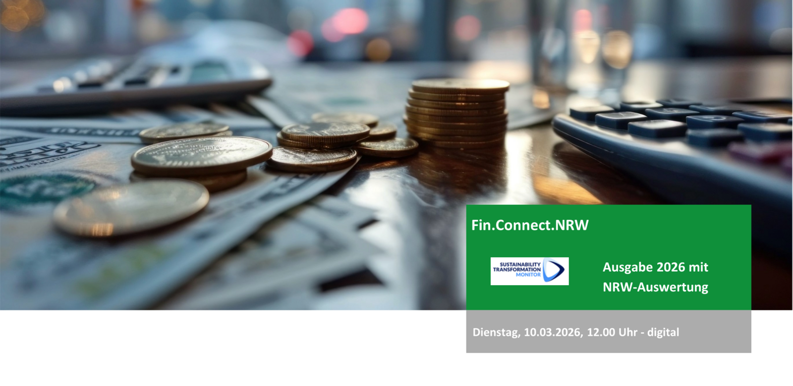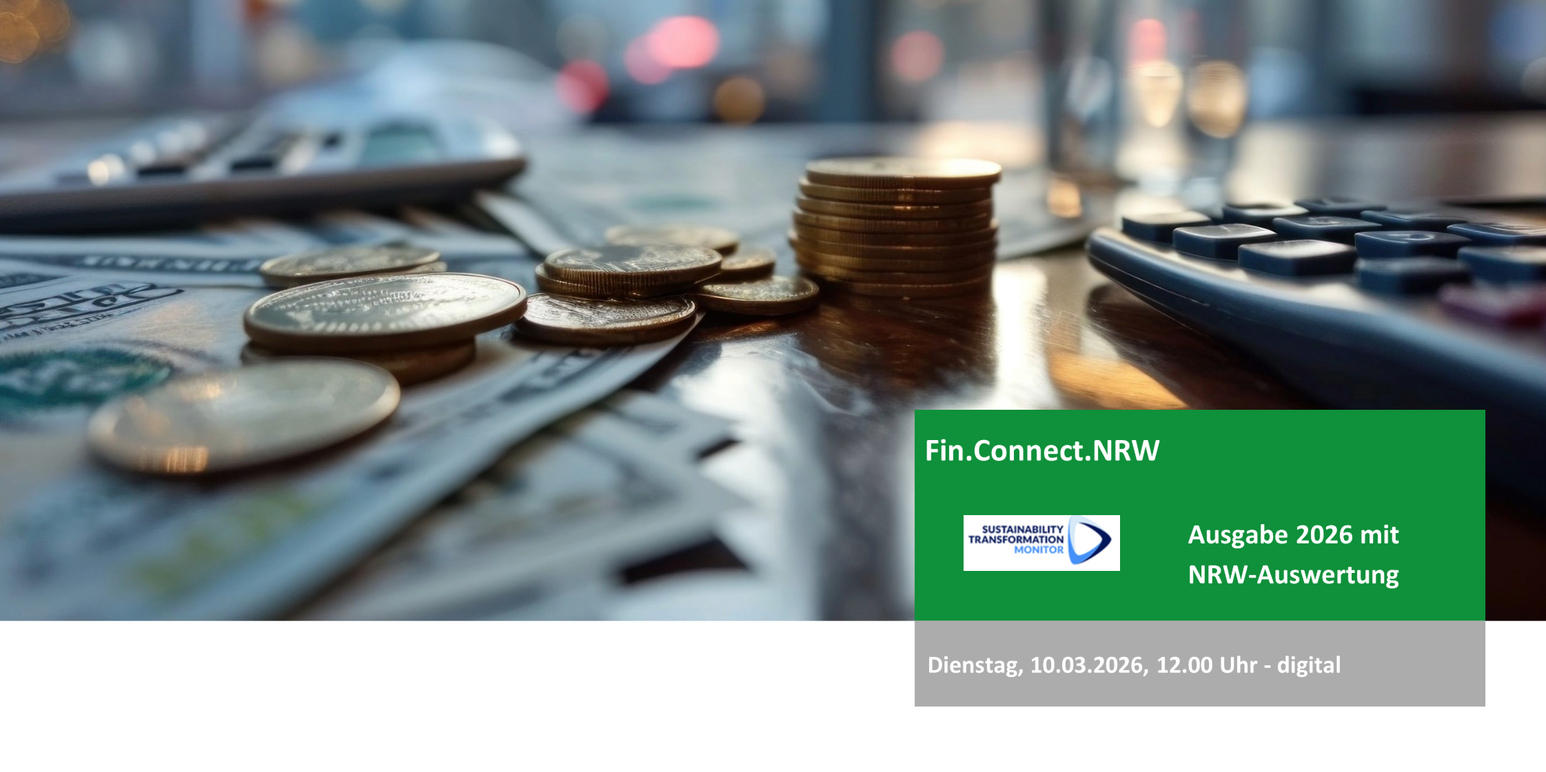 Fin.Connect.NRW lädt Sie herzlich zur digitalen Vorstellung des Sustainable Transformation Monitor 2026 ein. Die Ergebnisse des STM26 ermöglichen erneut einen fundierten Blick in den Maschinenraum von Real- und Finanzwirtschaft – ergänzt um eine regionale Auswertung für NRW.